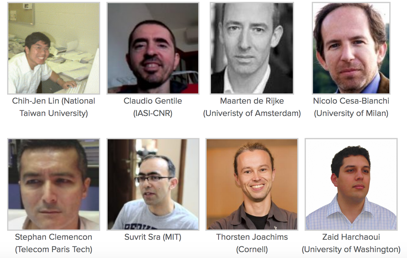 Chih-Jen Lin, Claudio Gentile, Maarten de Rijke, Nicolo Cesa-Bianchi, Stephan Clemencon, Suvrit Sra, Thorsten Joachims, Zaid Harchaoui